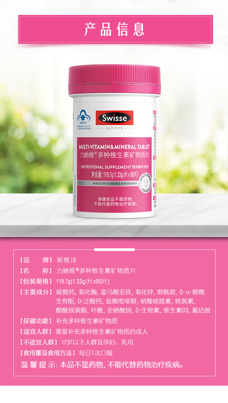 商品名称:斯维诗力她维女士多种维生素矿物质片90片