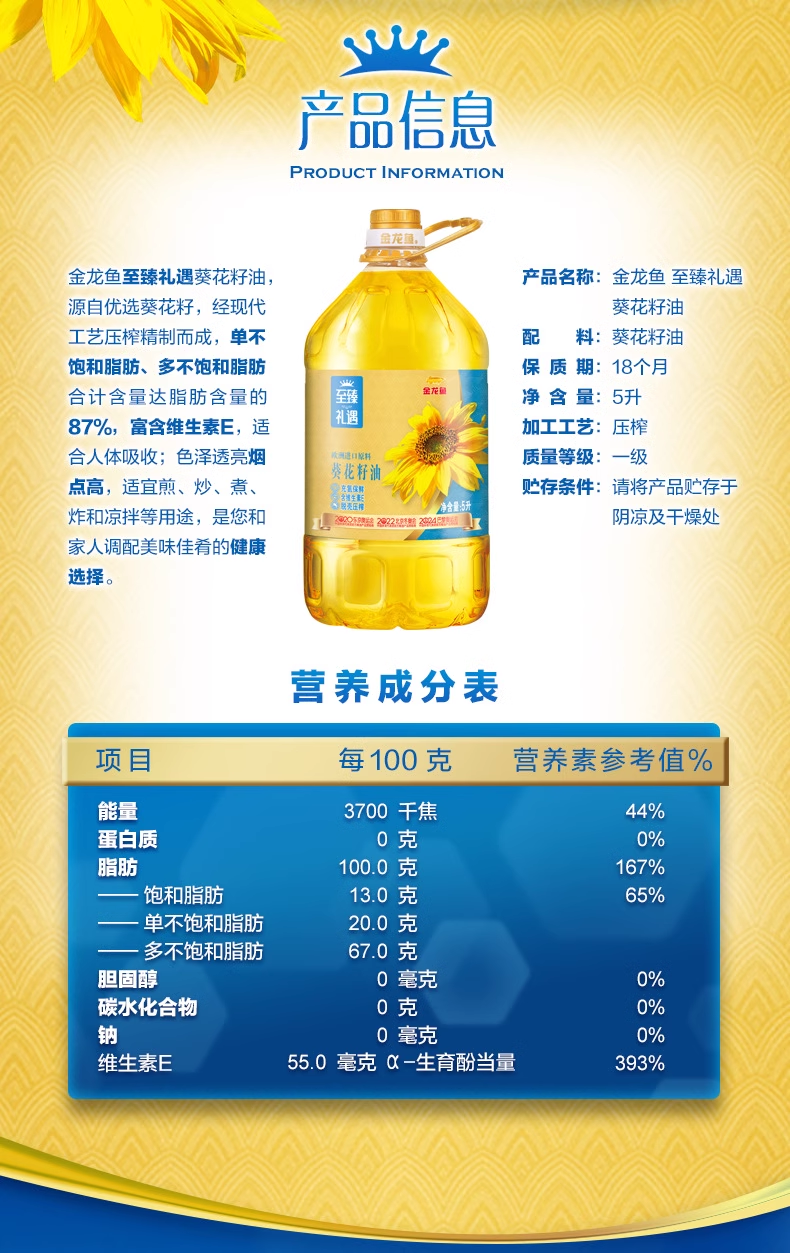 商品名称:金龙鱼至臻礼遇葵花籽油5L