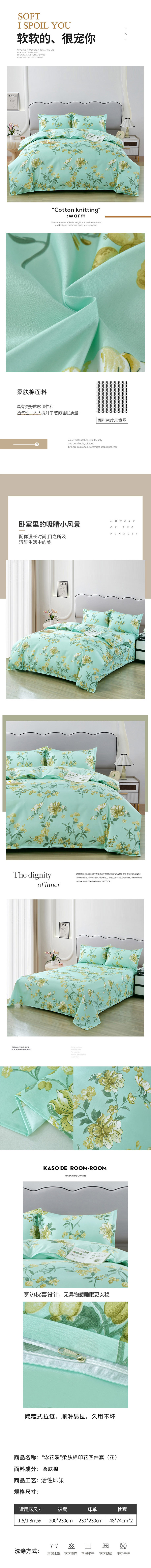 商品名称:“念花溪”柔肤棉印花四件套(随机花型)被套:200*230 床单:230*230 枕套:48*74*2