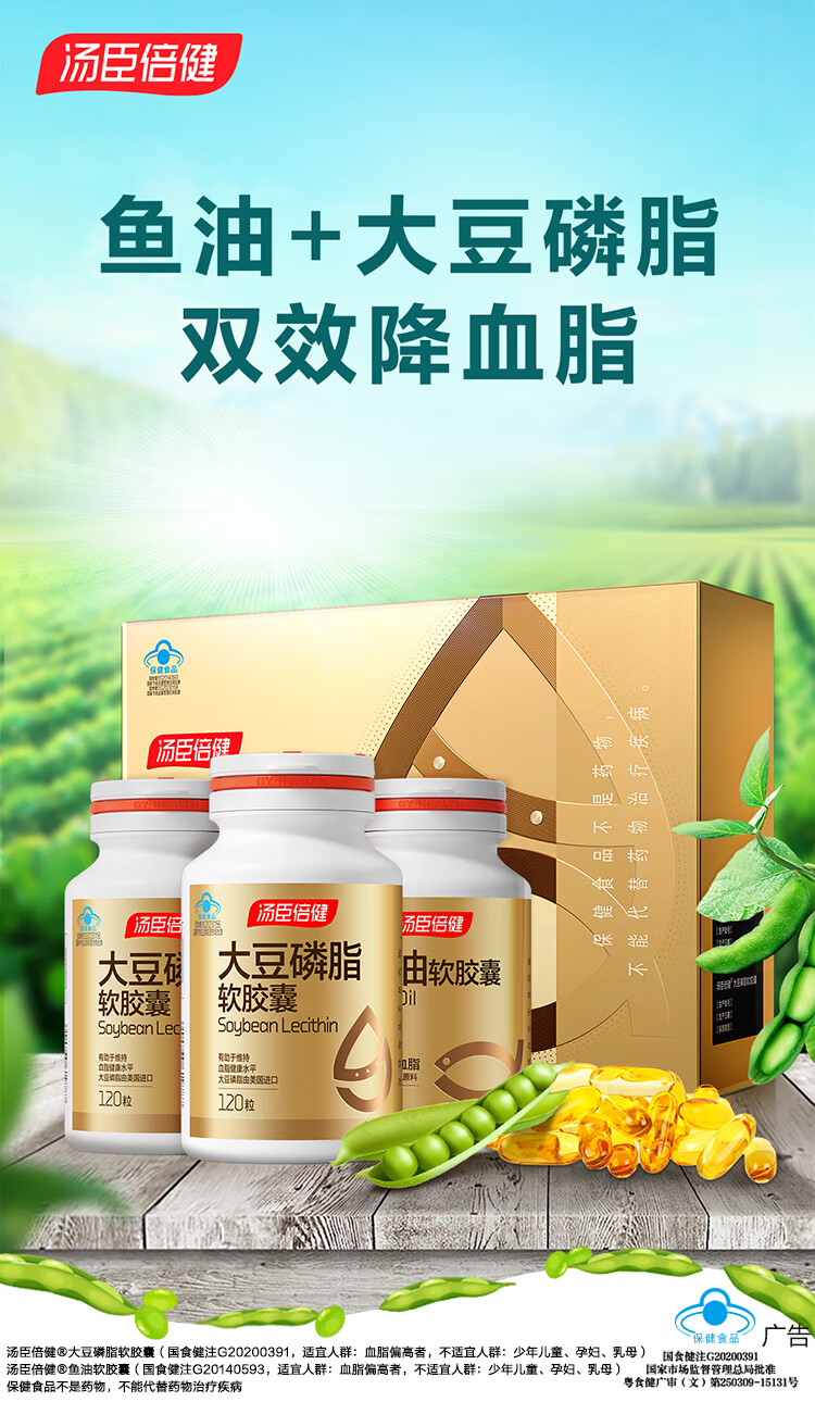商品名称:汤臣倍健大豆磷脂软胶囊+鱼油软胶囊【磷脂120粒×2+鱼油100粒】